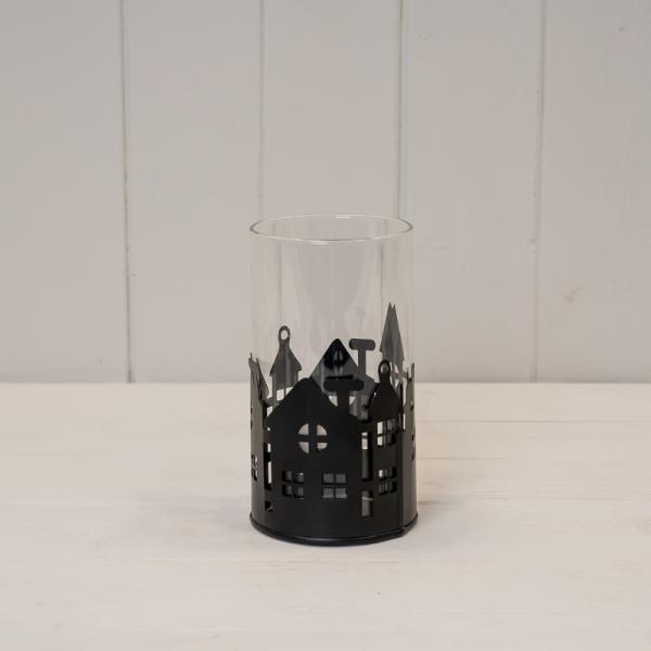 Small Black Metal House Scene Candle Holder with Glass Insert