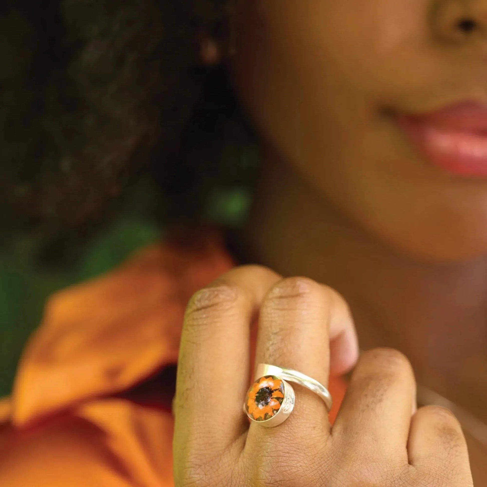 Bring a burst of sunshine to your style with this Sterling Silver Adjustable Orange Sunflower Ring, handmade with real flowers by Shrieking Violet®. A close relative of the sunflower, the Brown-Eyed Susan represents resilience, encouragement, and optimism. Sunflowers symbolize happiness, positivity, and strength, making this ring a powerful reminder to embrace the brighter side of life. The real sunflower, beautifully preserved in resin, shines against the backdrop of a sleek .925 sterling silver adjustable band, offering both comfort and elegance. Whether you're looking for a unique gift or an uplifting addition to your own collection, this sunflower ring is the perfect way to celebrate nature's radiant beauty.